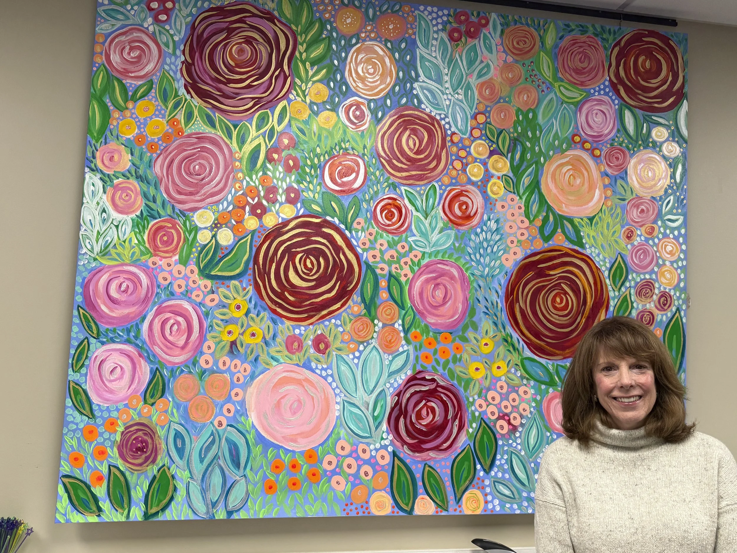 Since having my own cancer journey, I made myself a goal to get happy, encouraging color in front of other cancer patients and now my 5 ft. x 6 ft. painting greets patients as they sign into the registration desk at the Zangmeister Cancer Center in Columbus, Ohio!