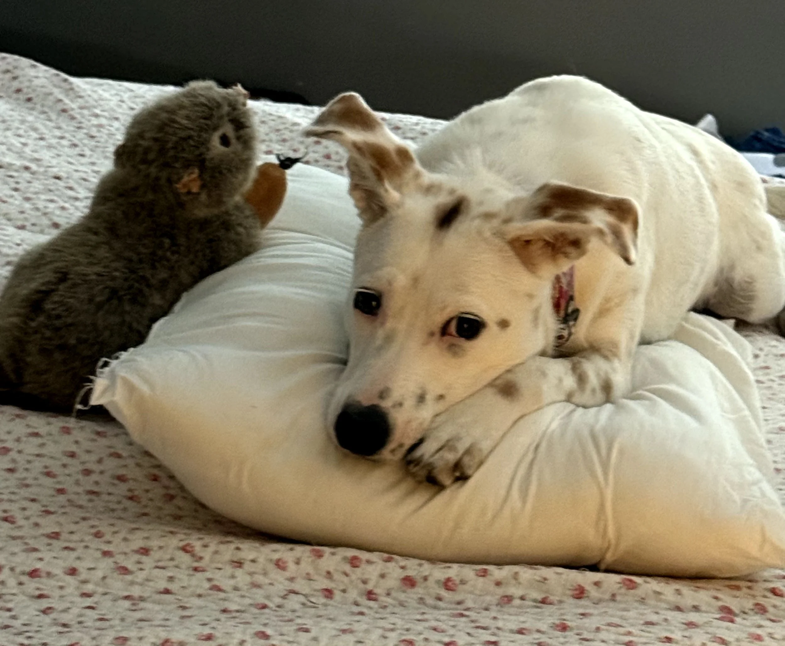 Meet Cleo, short for Cleopatra since she is sporting permanent kohl-lined eyes! She and her siblings were dumped on a country road back in January when our temperatures were wickedly low. We rescued Cleo (as all of her siblings were rescued) and have been loving her antics ever since! As part cattle dog, she is a herder, a chewer, is very smart and curious. She is very sweet and protective and so far feels the need to alert everyone in the building when she hears things! We are working on her role as a (quiet) studio dog!